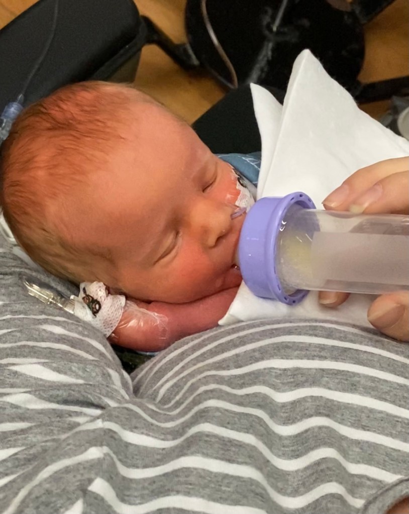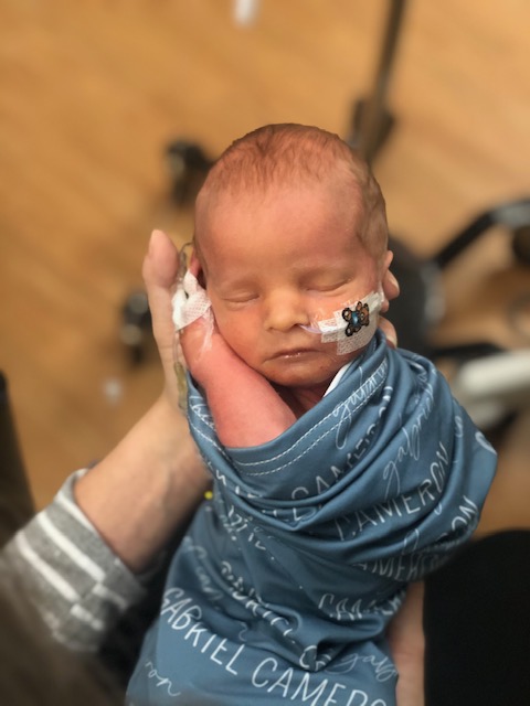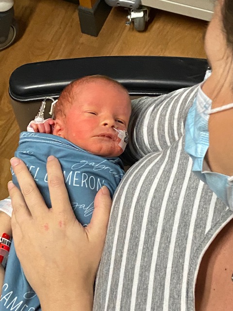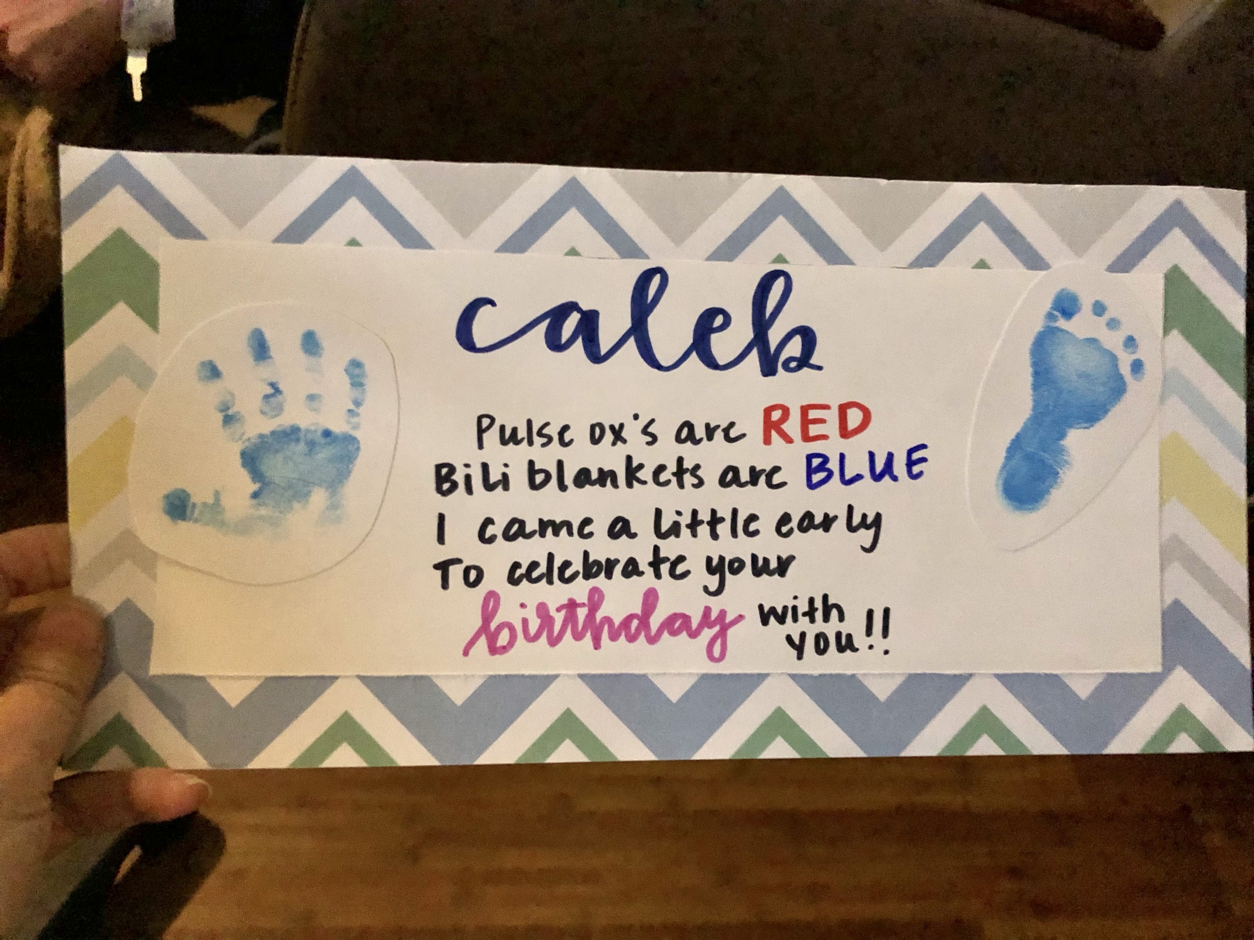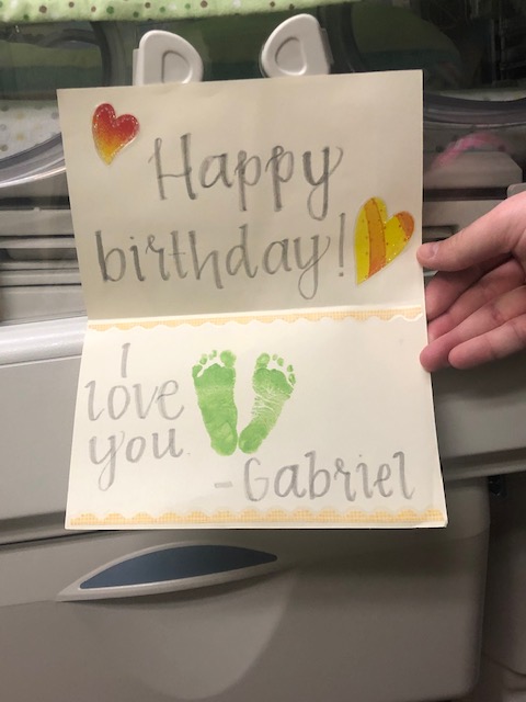 We are technically on the 8th floor of Carolina Medical Center and Levine Children’s Hospital is connected to us. To see the the boys, we have to get daily badges to get into the Children’s Hospital side. It takes a good amount of time to get to the NICU to see Gabriel on the 7th floor of LCH and then to get to the 6th floor to see Caleb in the Cardiac ICU. It’s not easy since they aren’t connected in the way you’d imagine. We went to see Gabriel first. When we got there, he had ripped out his own IV and they were replacing it. It had just been changed and he was getting a diaper change when we got there. He was a bit awake and the nurse asked if we wanted to feed him his first bottle. He did SUCH a great job at taking his first bottle! We are so excited to see his progress and how well he was doing! Adam is the sweetest husband and daddy and asked if it would be ok if the nurses would take up a sign on their beds wishing me happy birthday! The night-shift nurses made signs with footprints and it was JUST what I needed! This sweet boy is definitely helping us emotionally and mentally during the tough moments. Dr. Engstrom was there and walked up to us to chat. I thanked him again for his wonderful visit with us and his prayers. He said, “I never want to leave the Lord out”. He is just the sweetest.